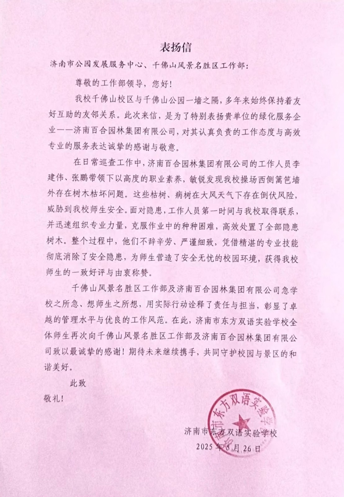 在濟(jì)南市東方雙語實(shí)驗(yàn)學(xué)校千佛山校區(qū),與千佛山公園的 “友鄰情誼” 近日再添溫暖篇章 —— 一封滿含感激的表揚(yáng)信,訴說著校園安全守護(hù)者的擔(dān)當(dāng)故事。