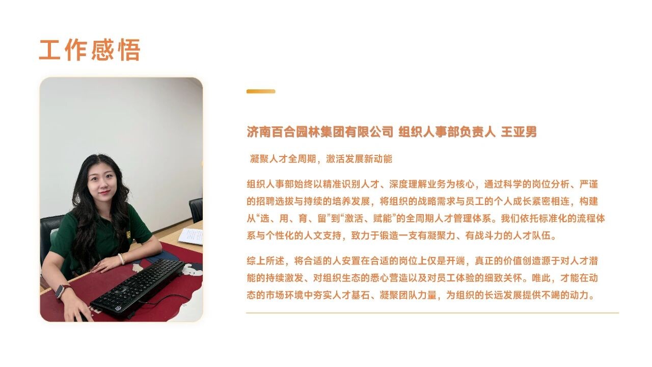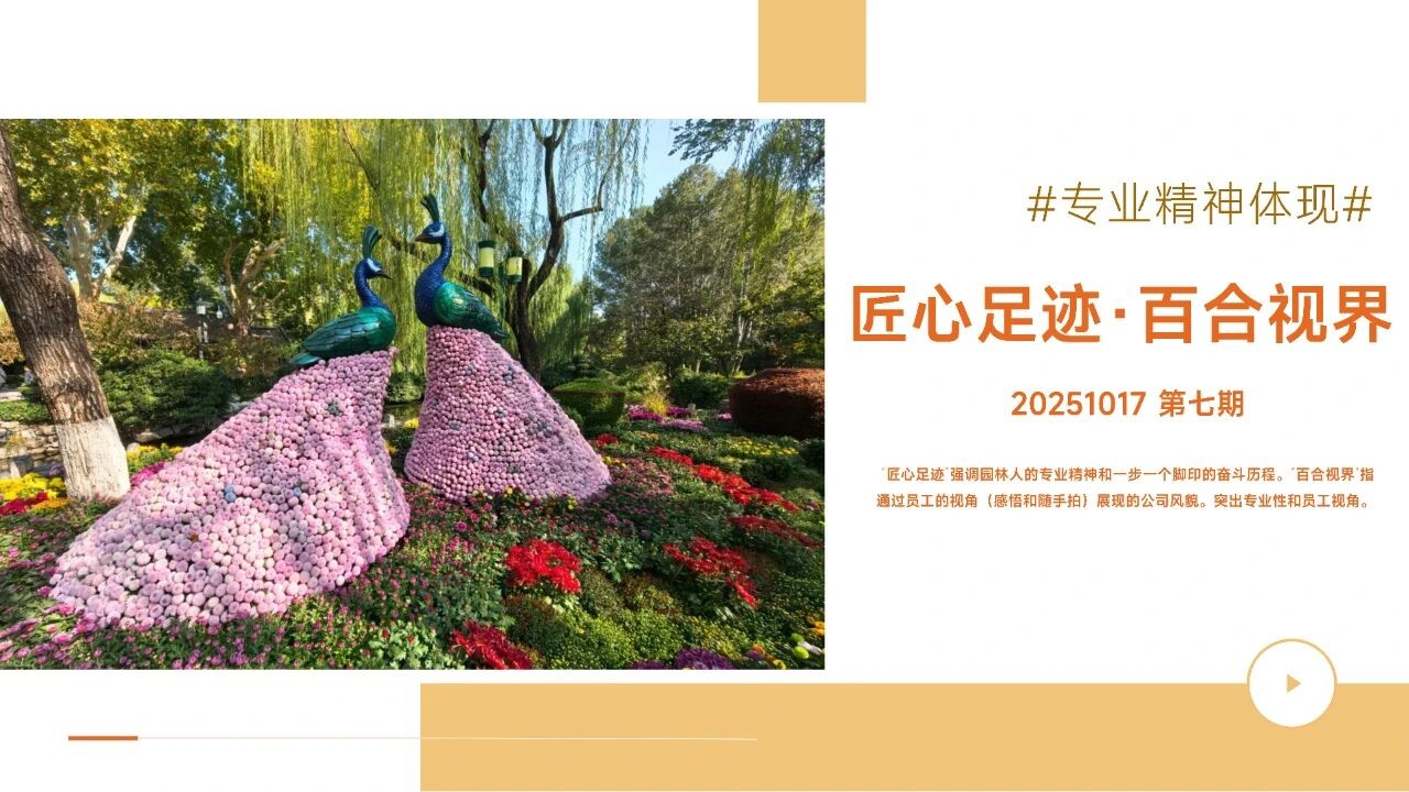 匠心足跡 強(qiáng)調(diào)園林人的專(zhuān)業(yè)精神和一步一個(gè)腳印的奮斗歷程。“百合視界“指通過(guò)員工的視角(感悟和隨手拍)展現(xiàn)的公司風(fēng)貌。突出專(zhuān)業(yè)性和員工視角。